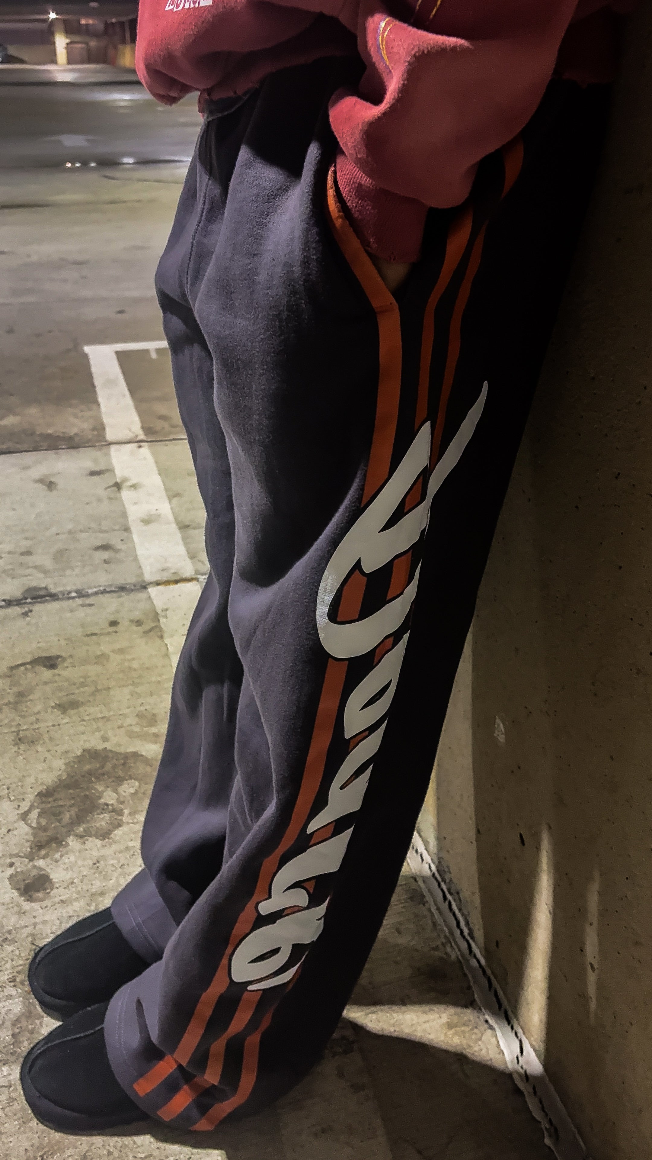 Navy track pants with gold triple stripes and bold “Find Peace” graphics down each leg. A relaxed wide-leg fit built for comfort and everyday wear.